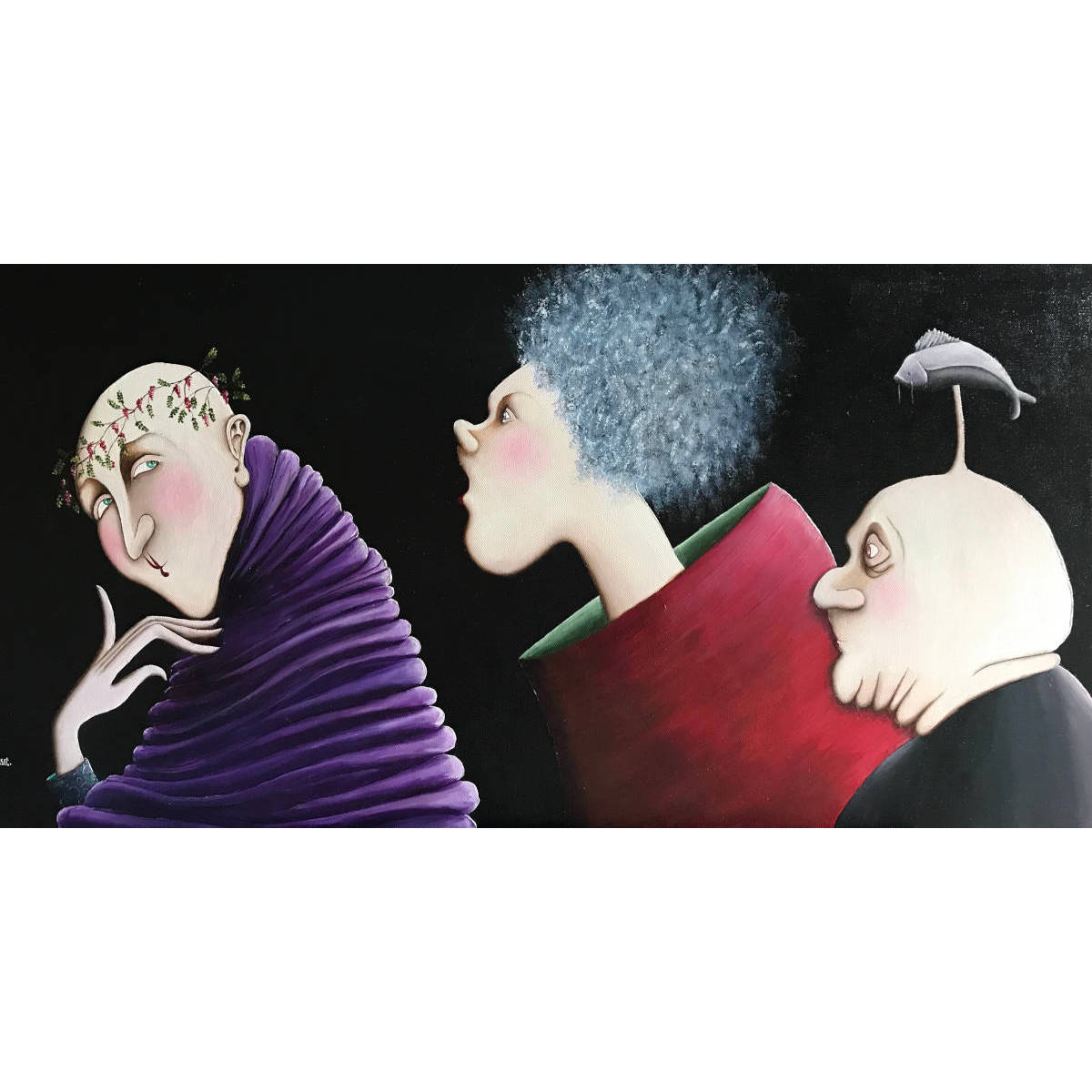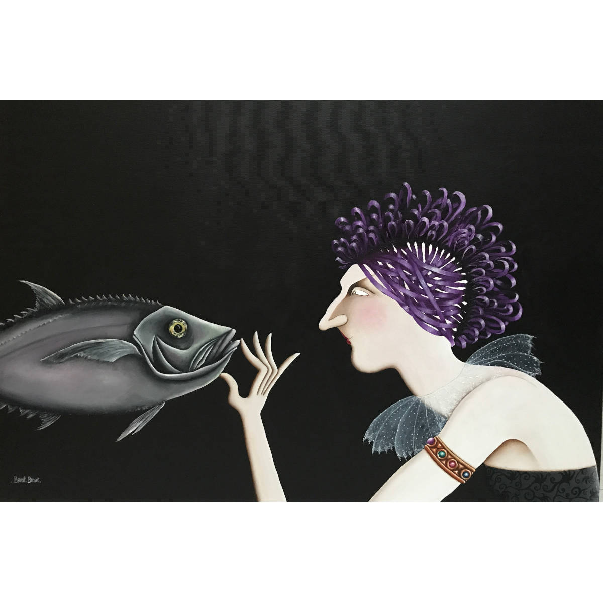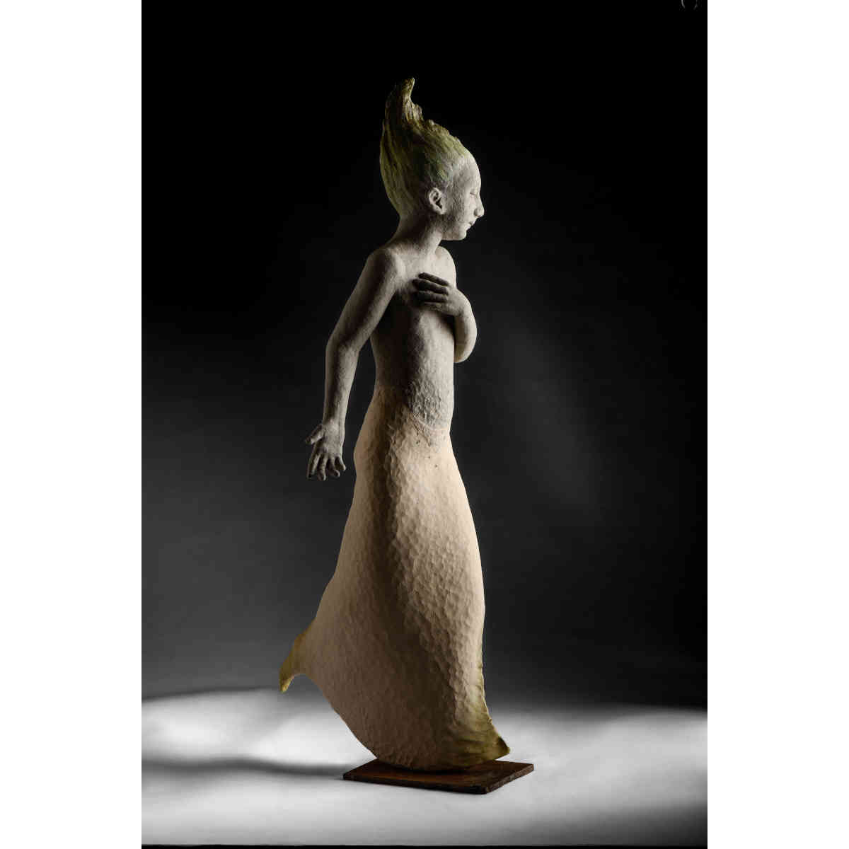 J’aime relier ce que l’humain a de plus intime à une représentation parfois décalée si la nécessité s’en fait sentir, imprégnée en cela de mythes dont je ne suis pas toujours consciente. Partie d’une figuration relativement symbolique, prenant ses racines dans un imaginaire nourri de l’art de civilisations éloignées de la mienne, je me suis acheminée vers une représentation d’êtres charnels qu’on croirait connaître, si ce n’est que bien souvent la chimère les rejoint et donne un sentiment d’étrangeté.