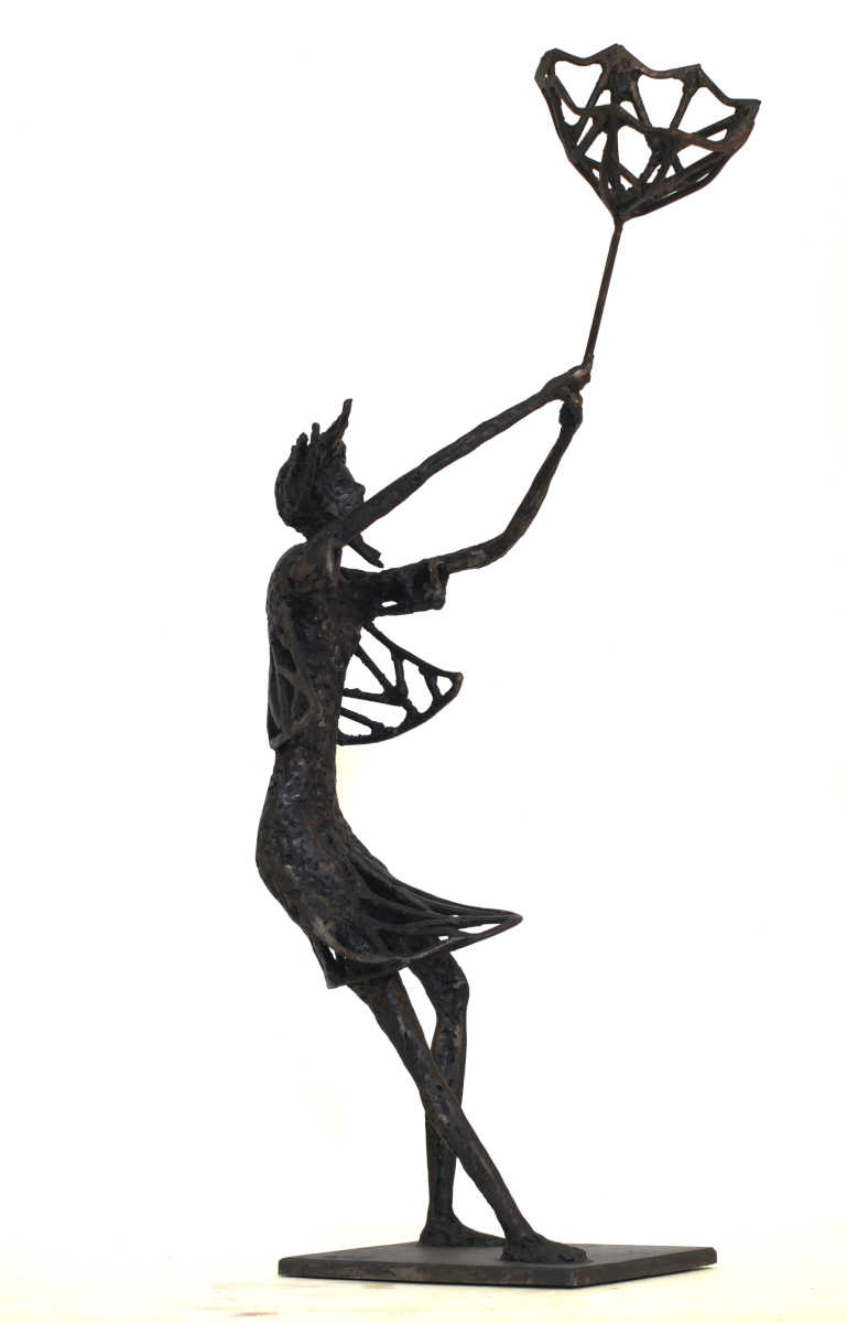 L’artiste travaille l’acier. Mesurer, couper, plier, percer, souder, meuler : la construction d’un squelette solide et rigide. Autour de cette base dure, elle torture et façonne des tiges de métal à l’étau, élaborant la chair et la peau qu’elle viendra texturer et unifier. Le sculpteur peut enfin s’approcher de son but, une illusion de légèreté, un mouvement, un envol. Le matériau s’est effacé devant l’art du modelage, l’œuvre va éclore dès que le mouvement sera juste.
